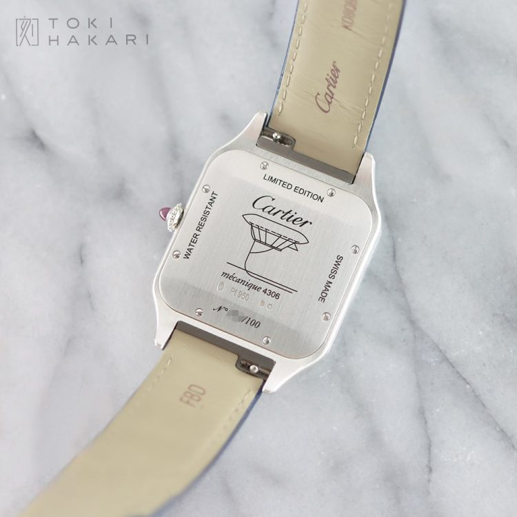 サントス・デュモンならではのアイコニックなスクエア型ケースは、現代的なXLサイズ(46.6mmx33.9mm)となっており、白い輝きのプラチナケースに赤いルビーのカボションが程よいアクセントを加えています。