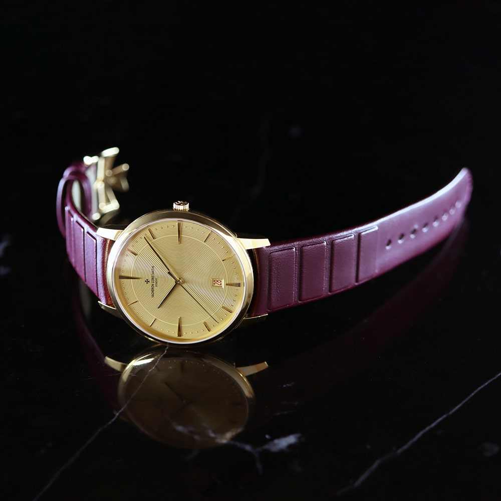 本モデルには、角を落としたレクタンギュラー型のアクセントが特徴的なバーガンディ色のカーフストラップが付属しており、ケース・文字盤のサークル模様と印象的なコントラストを描きます。