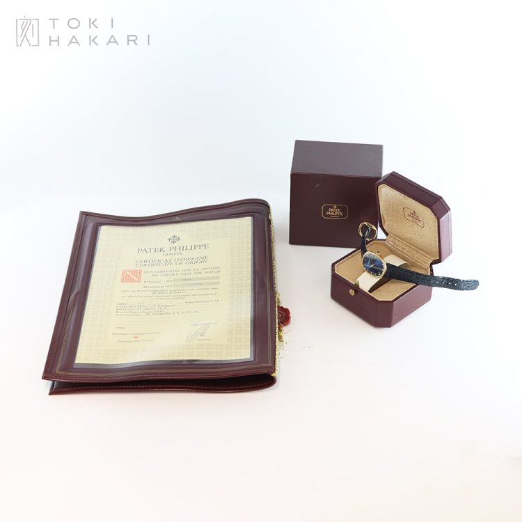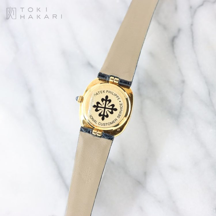 本個体は、クラシカルな印象のイエローゴールドモデルとなっており、27mm×32mmの小ぶりなケースに60個のダイヤモンドがセッティングされたベゼルとダイヤルカラーに合わせたサファイアのカボション付き竜頭を備えています。