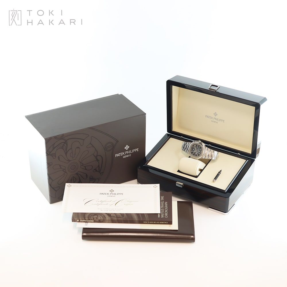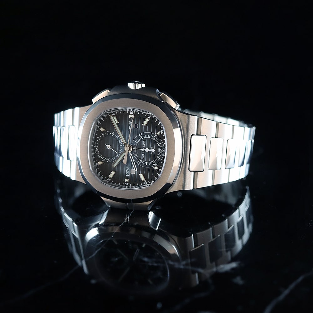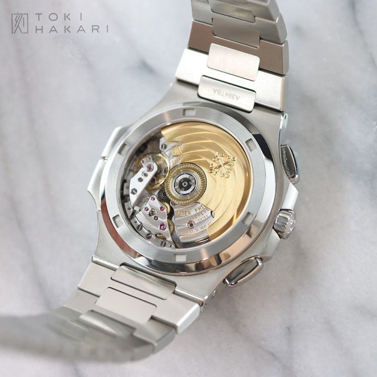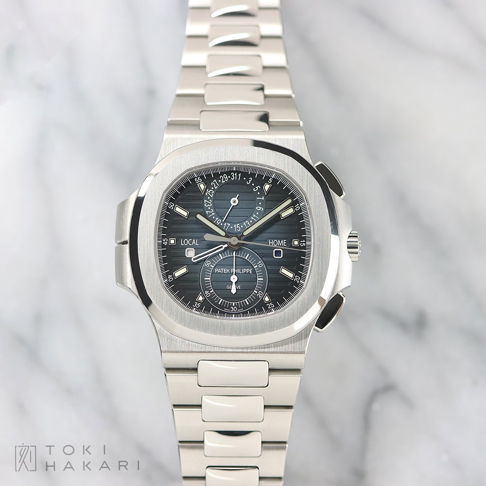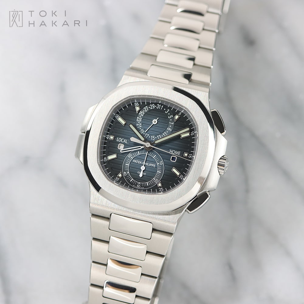 2014年初出となる「Ref.5990」モデルは、ノーチラスの特徴的なケースに「トラベルタイム」「現地の日付指針表示」「フライバック・クロノグラフ」といった3つのコンプリケーションを搭載しています。