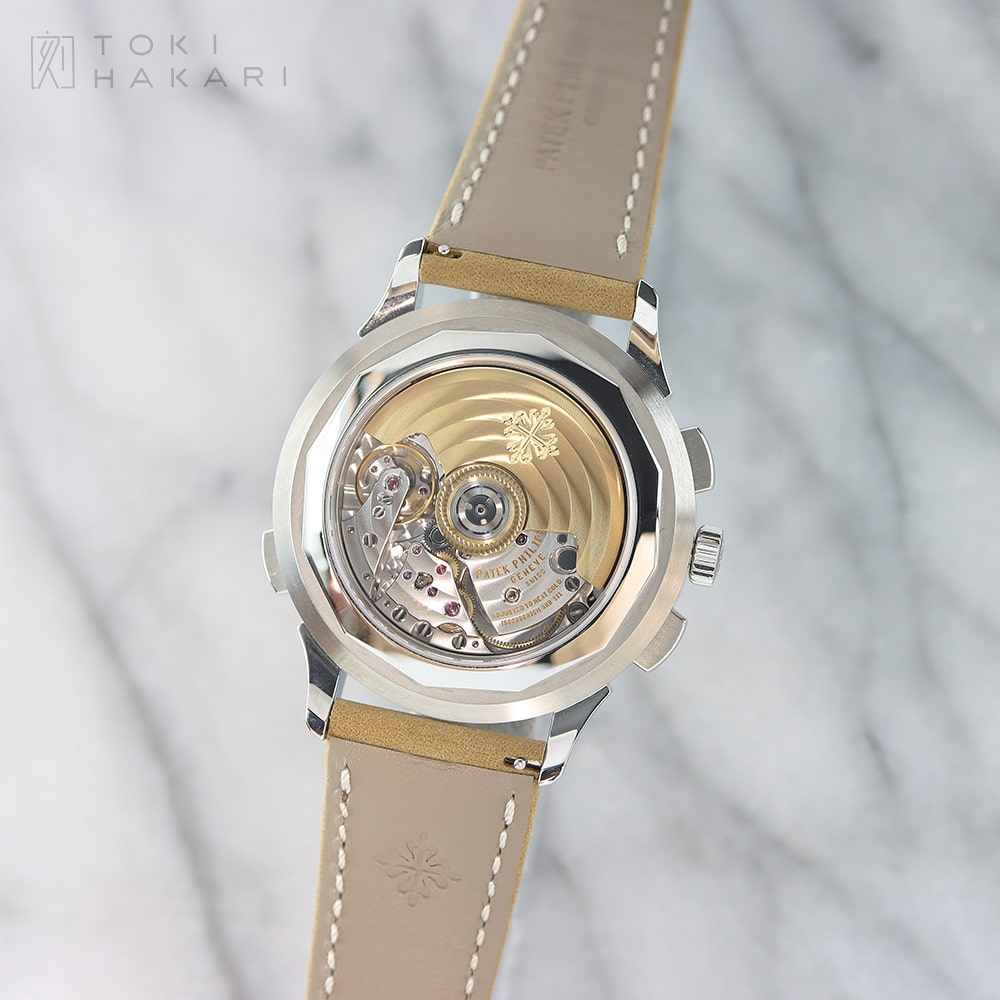 現代的なサイズの直径41mmケースは、パテック・フィリップのコレクションでは希少なステンレススティールをケース素材に採用、複雑なケース形状でありながら冷間鍛造によって成形され、高度なポリッシュ仕上げが施される事で、貴金属のような美しい輝きを放ちます。