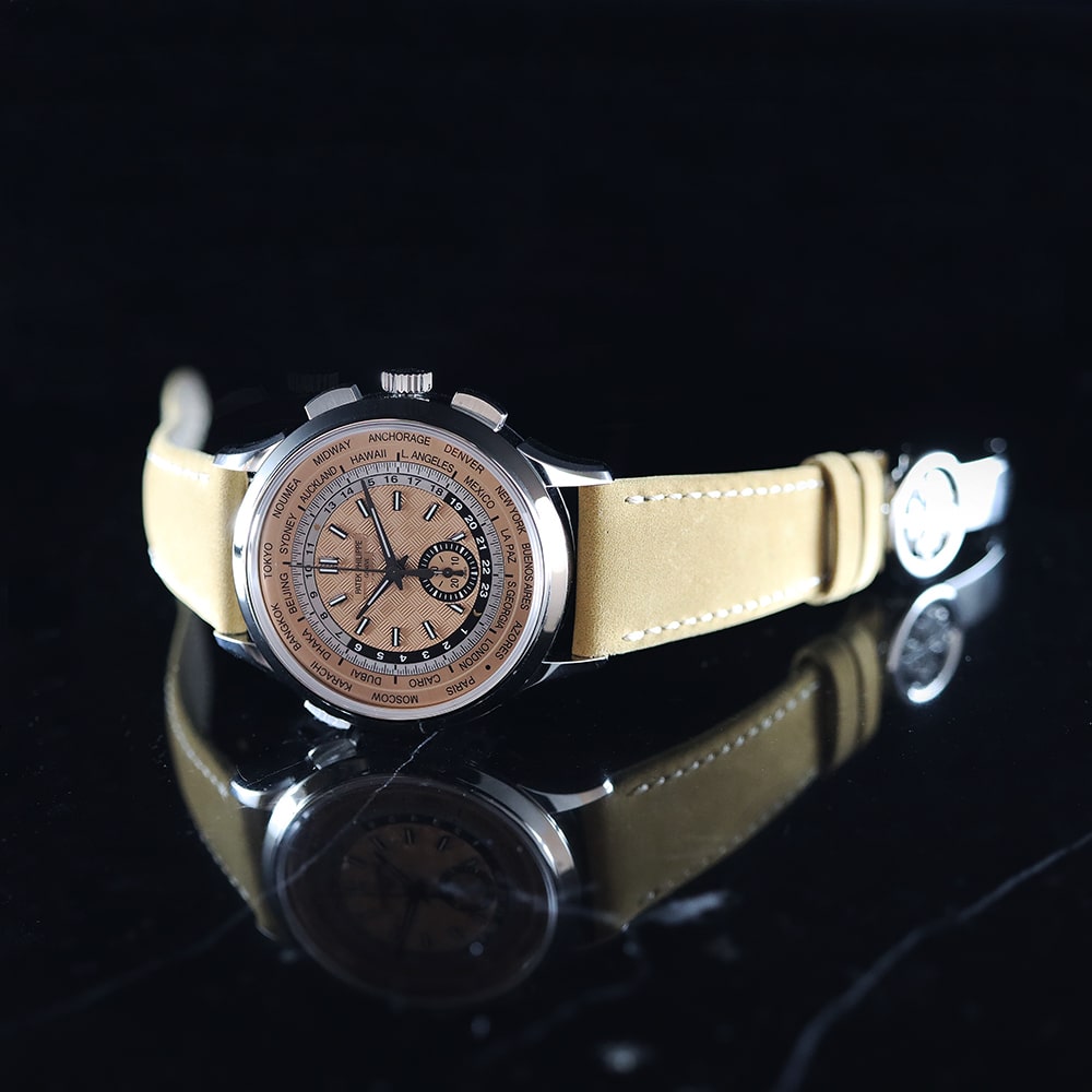 パテック・フィリップの重要なコンプリケーションである「ワールドタイム」と「フライバック・クロノグラフ」を兼ね備えた「Cal.CH 28‑520 HU」を搭載した初のステンレススティールモデルとなります。