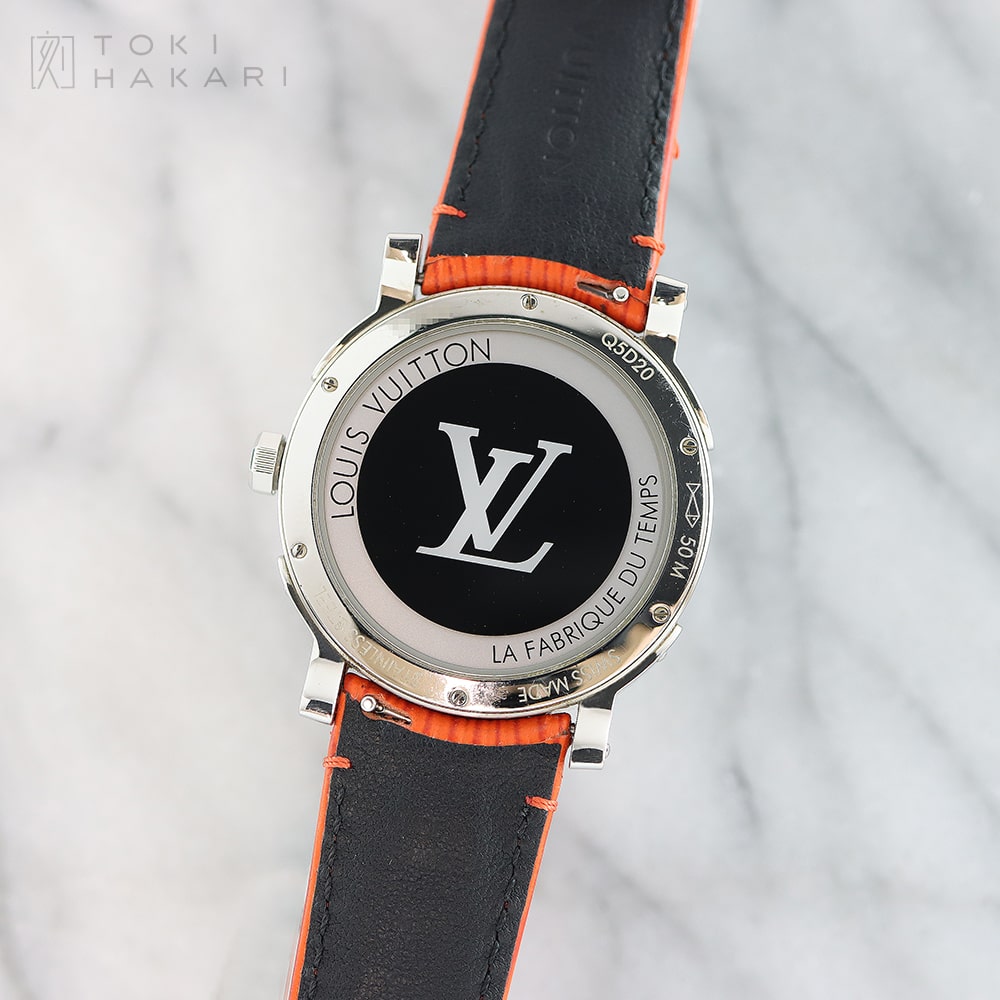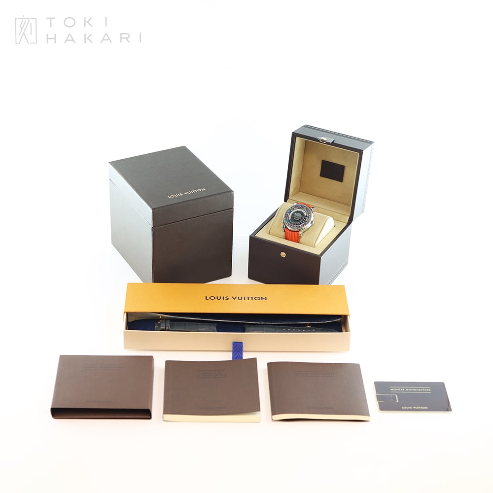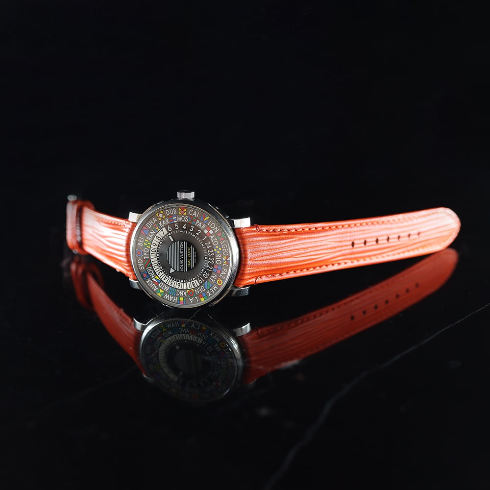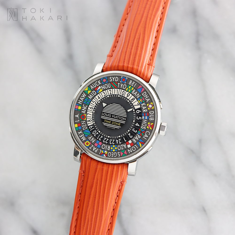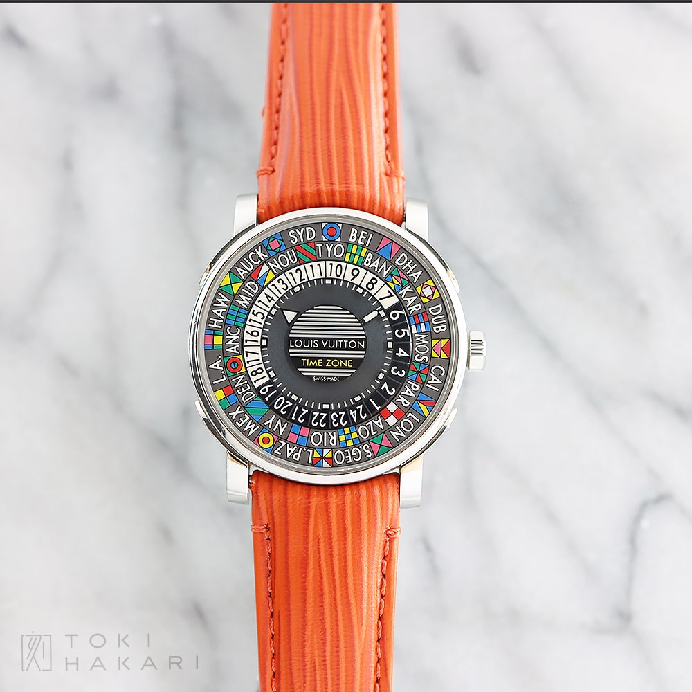 2015年に発表されたエスカル・タイムゾーン「Q5D200」は、日常使いに最適なステンレススティールをケース素材に採用したワールドタイムウォッチとなっており、ルイ・ヴィトンならではの遊び心ある色使いとデザインが特徴的です。
