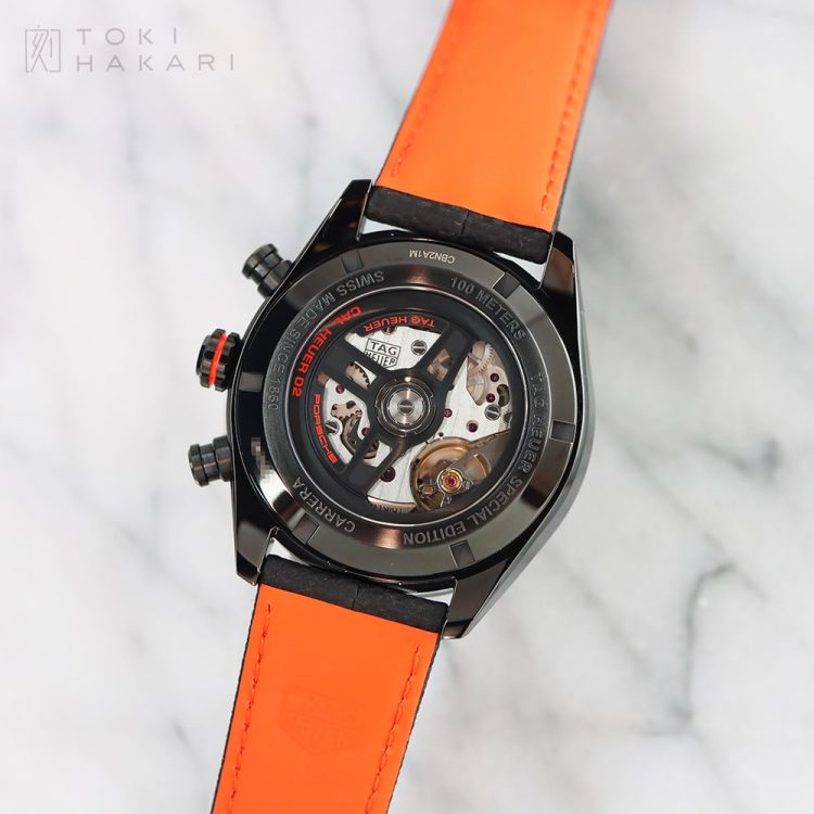 搭載ムーブメントは、自社製クロノグラフムーブメント「Cal.ホイヤー02」となっており、約80時間のロングパワーリザーブによる実用性の高さと、ポルシェのステアリングホイールをイメージした特別なローターを備えています。