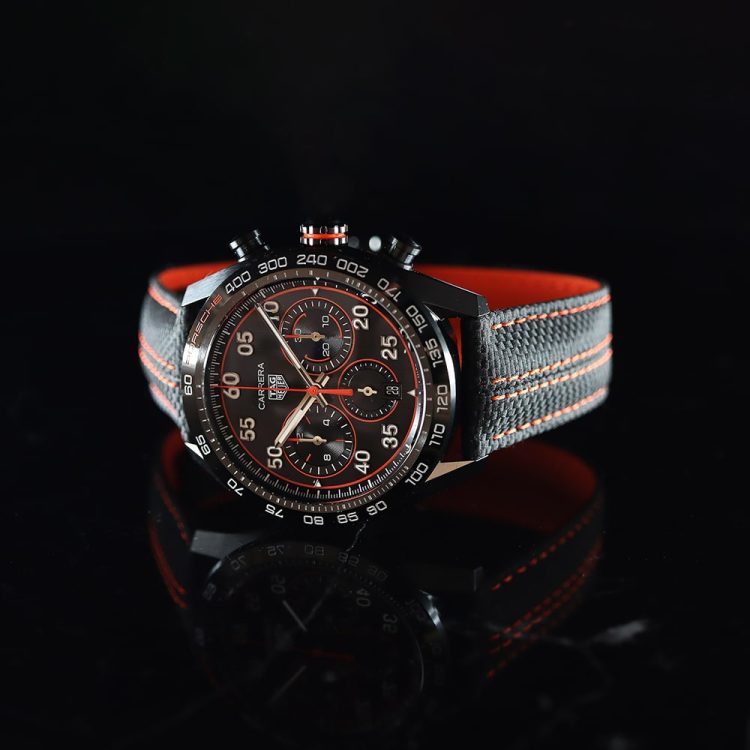 タグ・ホイヤーの人気モデル「カレラ キャリバー ホイヤー02 スポーツクロノグラフ」をベースにしており、44mmのステンレススティールケースにブラックのDLCコーティングが施され、タキメータースケールと「PORSCHE」の文字を配したブラックのセラミックベゼルを備えています。