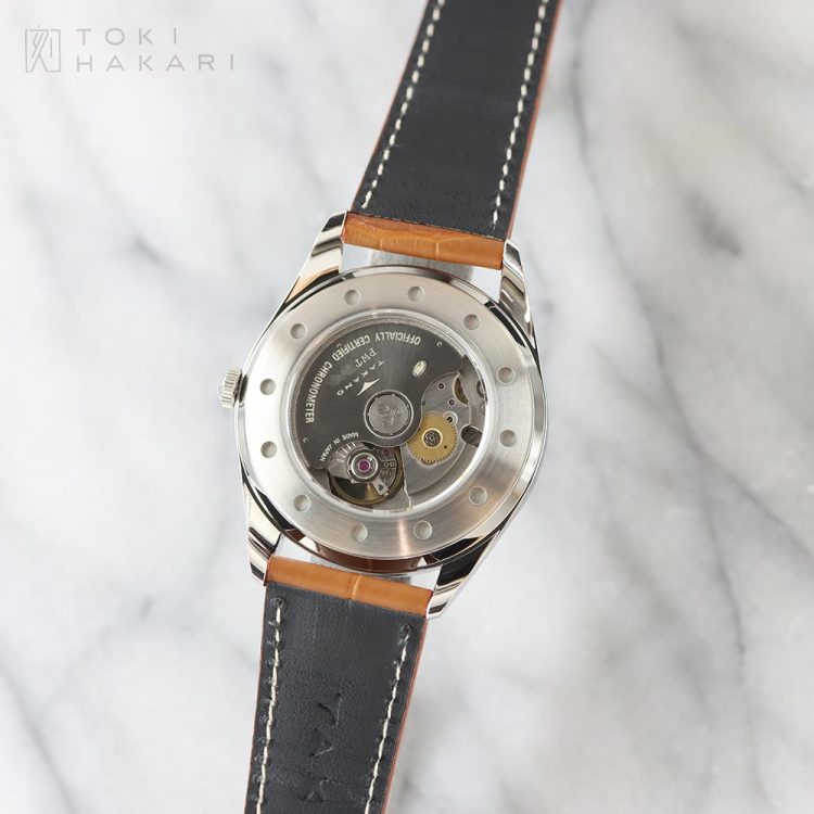 ムーブメントは東京時計精密にて調整が施され、ブザンソン天文台のクロノメーターを取得しており、21世紀の国産時計としては初めてとなる”Chronometer”の表記がダイヤルに刻まれています。