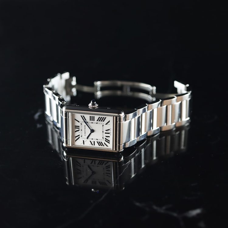 シルバー文字盤は、ローマン数字インデックスやレイルウェイ・ミニッツトラックを配したカルティエの伝統的なデザインが採用されており、流行に左右されないタイムレスな魅力を備えています。