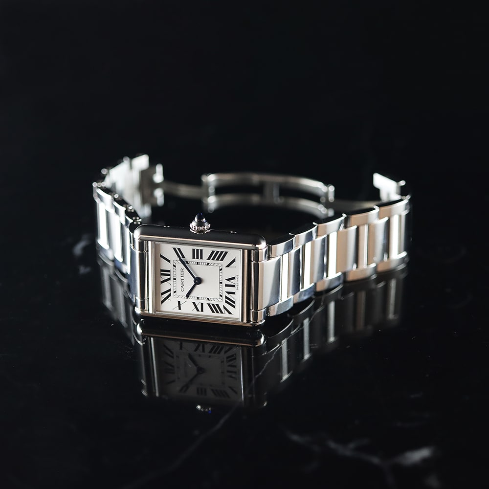 前モデル「タンク・ソロ」のシャープでフラットなケース形状から一変して、ケース・ブレスレットに丸みを持たせ、優美な印象となった「タンク・マスト」は、最新技術を用いた高効率のクオーツムーブメント(バッテリー寿命約8年)を搭載した実用性の高さも魅力です。
