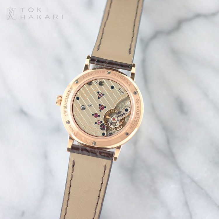 グラスバックからは、美しく装飾された洋銀製の3/4プレートやスワンネック緩急針などの見所を備えた手巻きムーブメント「Cal.L941.1」をじっくりと鑑賞いただけます。