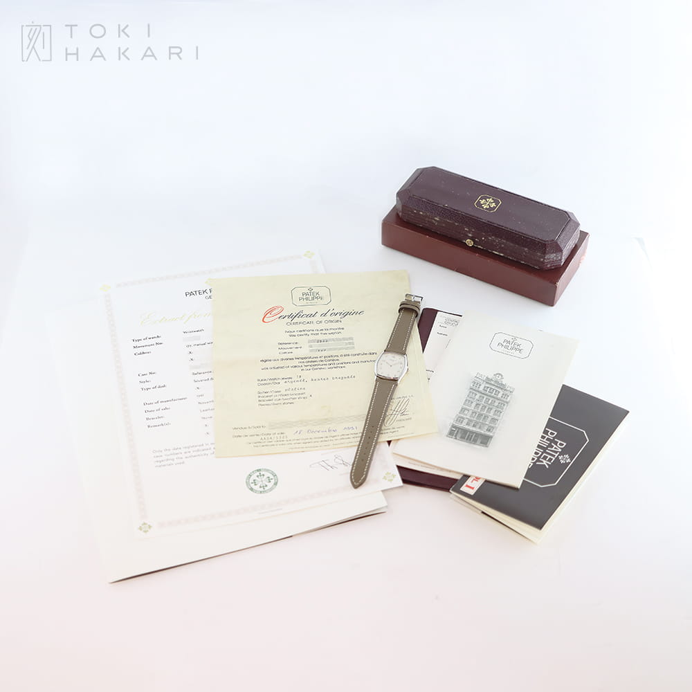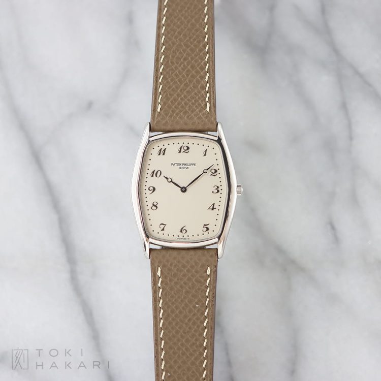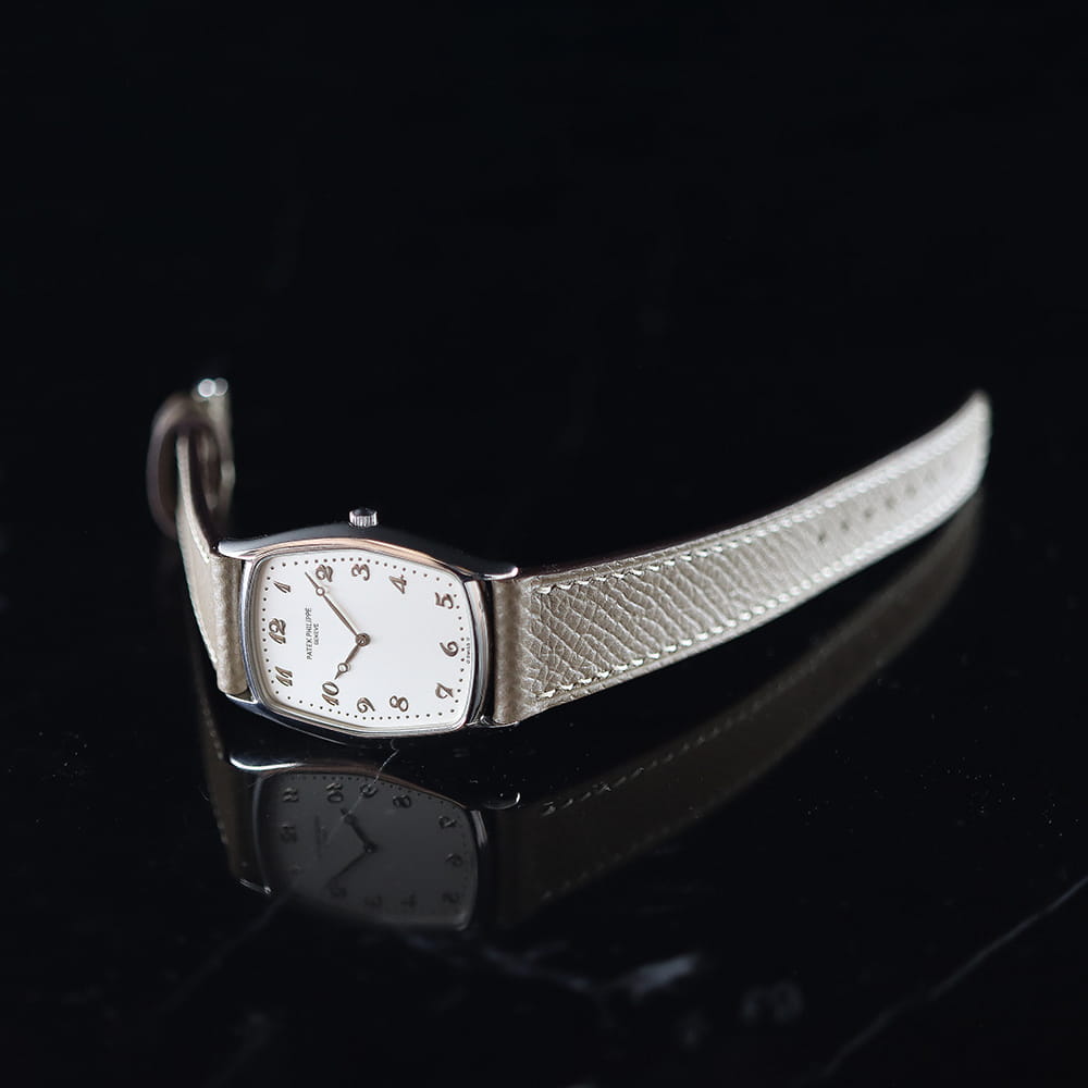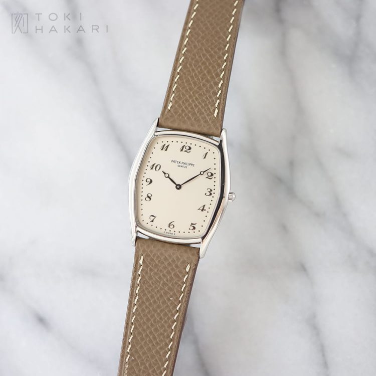 フレデリック・ピゲ製の「Cal.21」をベースに、パテック・フィリップによる調整と装飾が施されたジュネーブシール取得の薄型手巻きムーブメント「Cal.177」を搭載した、エレガントなトノーシェイプが魅力の「Ref.3842」。