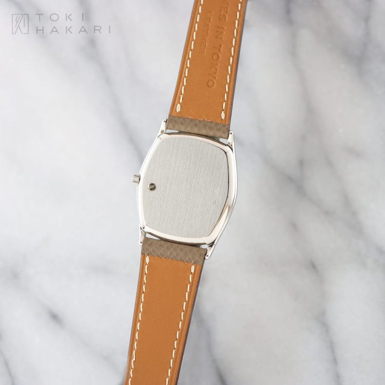 わずかにアクセントが加えられたトノーケースは、希少なプラチナ製となっており、小振りなサイズ(29mm×32mm)と薄型構造(5mm)が腕元をエレガントに飾ります。