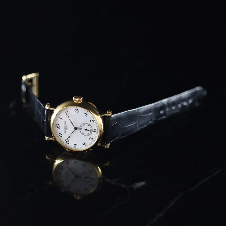 クラシックな印象を高めるイエローゴールド製ケースは、直径33mmの小振りなサイズとなっており、ケースバックを保護するヒンジ付きのカバー、玉ねぎ型リューズ、ネジ付きのストレートラグといったオフィサーケースの伝統的なスタイルが踏襲されています。