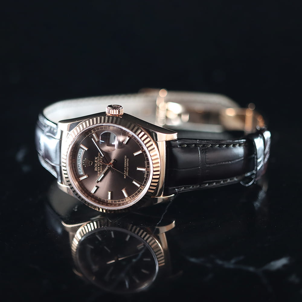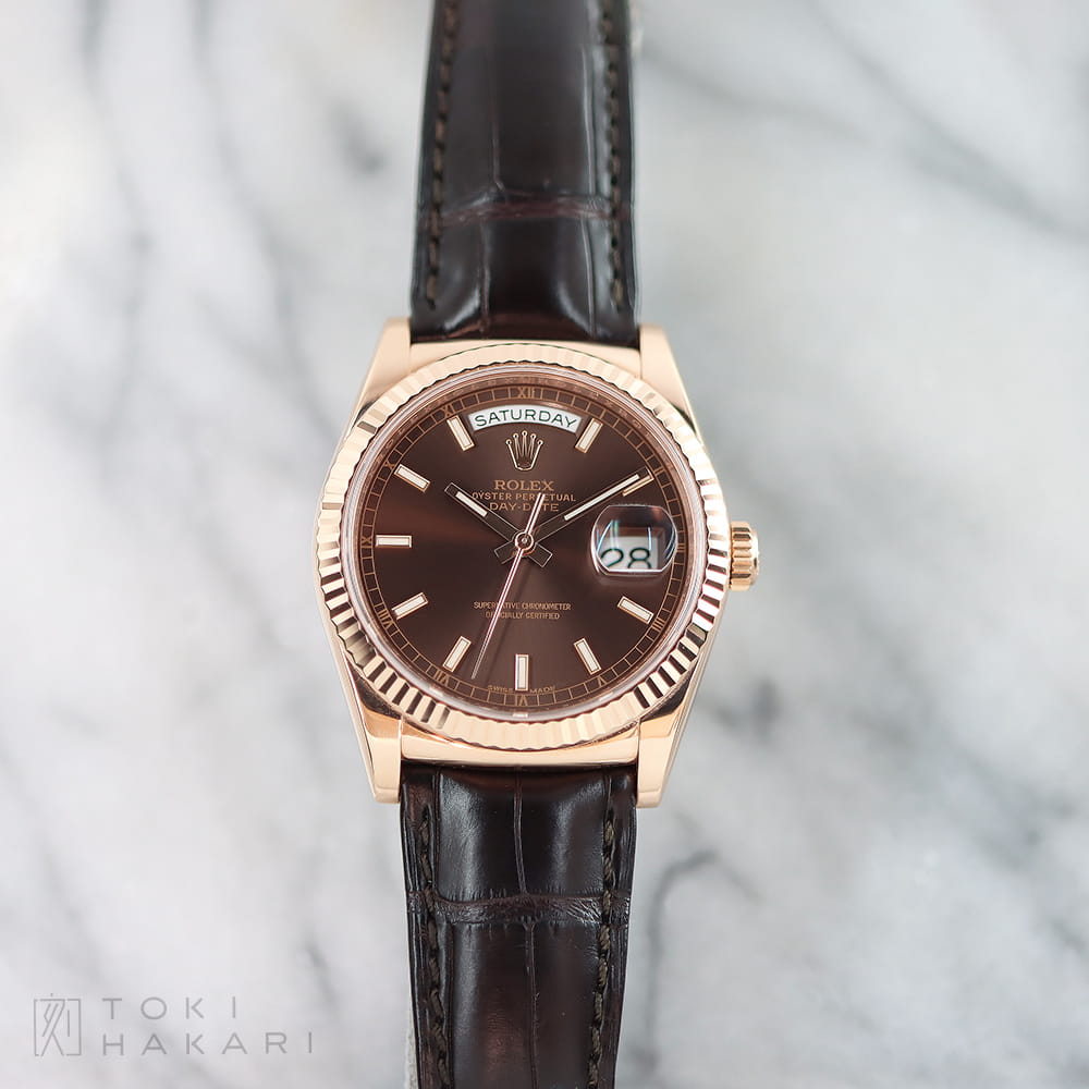2013年から2019年にわたり展開された「118135」は、お馴染みのプレジデントブレスレットとは異なるレザーストラップを備えた、ドレッシーな印象のデイデイトです。