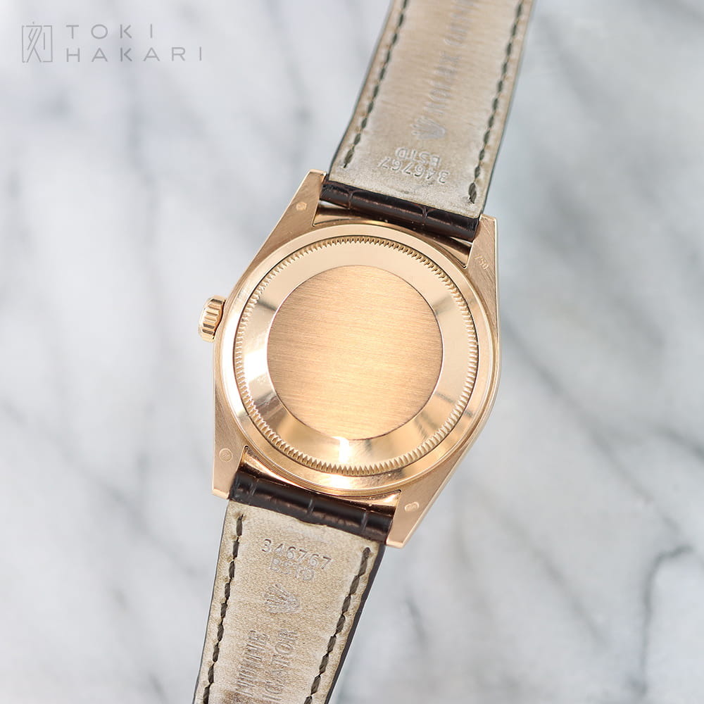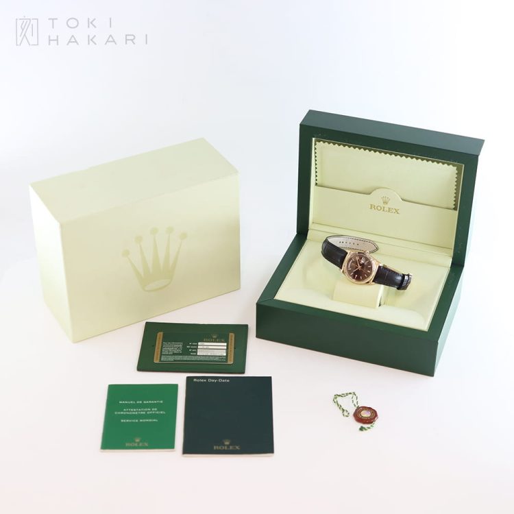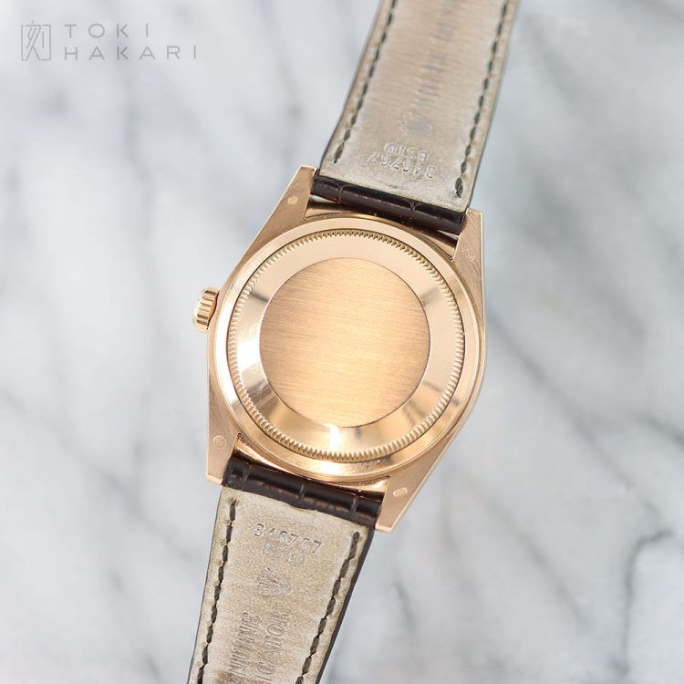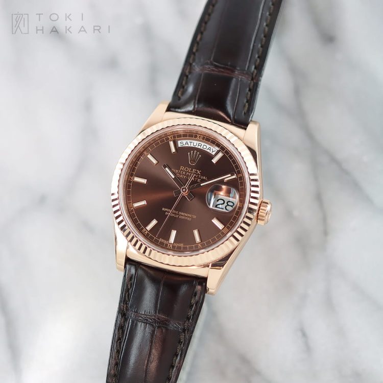 デイデイトのスタンダードサイズとなる直径36mmケースは、ロレックス独自のエバーローズゴールドを採用しており、赤みを抑えた上品な色合いと耐変色性の高さが魅力です。