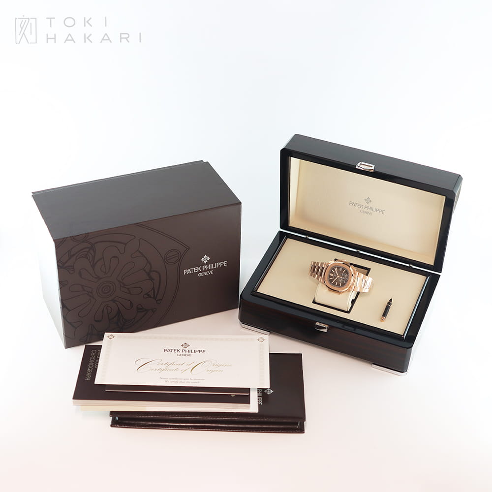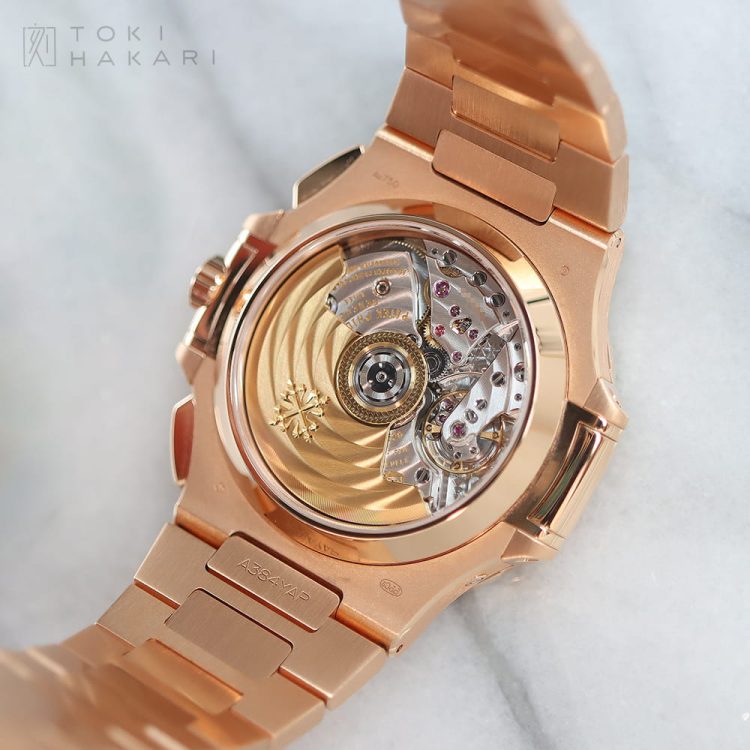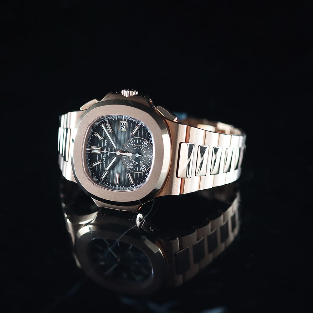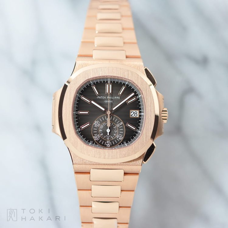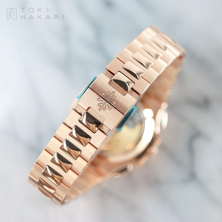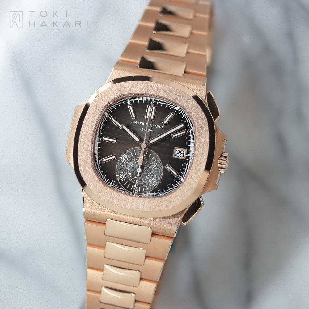 2013年から2024年にわたり展開された「Ref.5980/1R-001」は、18Kローズゴールド製のケース&ブレスレットにブラックグラデーションのダイアルを組み合わせたモデルとなり、赤みが強く華やかな印象のローズゴールドとRef.5980の持つカジュアルかつエレガントなデザインが見事にマッチしたラグジュアリーな一本となっています。