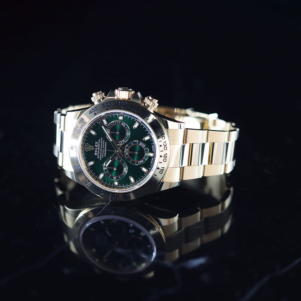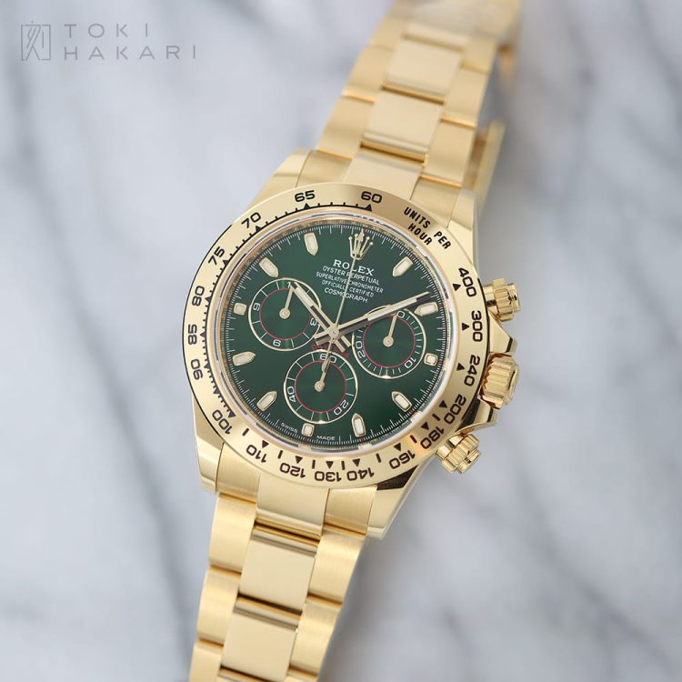 2016年から2023年にわたり生産された「Ref.116508」グリーン文字盤は、ラグジュアリーな18Kイエローゴールド製のケース&ブレスレットに、ロレックスのコーポレートカラーでもあるグリーン文字盤を採用したモデルです。